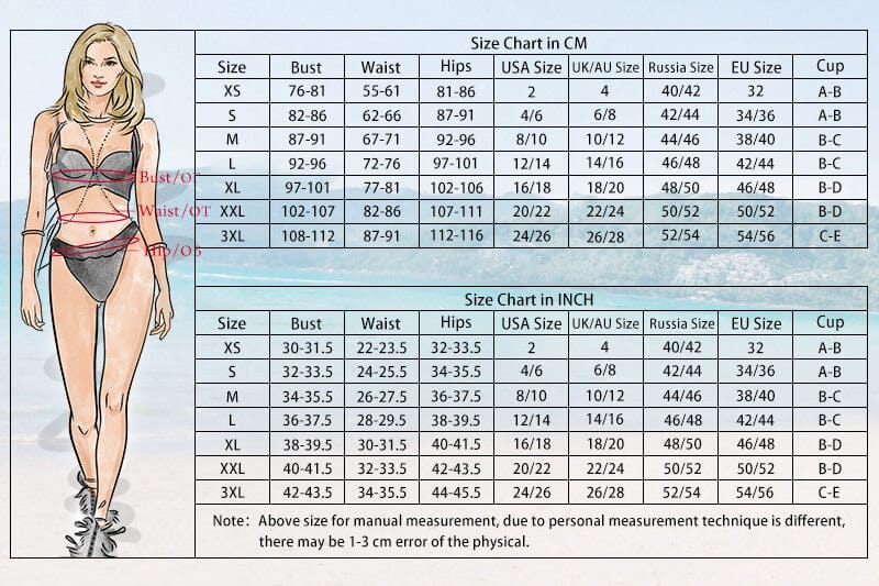 Größentabelle für sexy, wendbare, hoch geschnittene, einteilige Badeanzüge