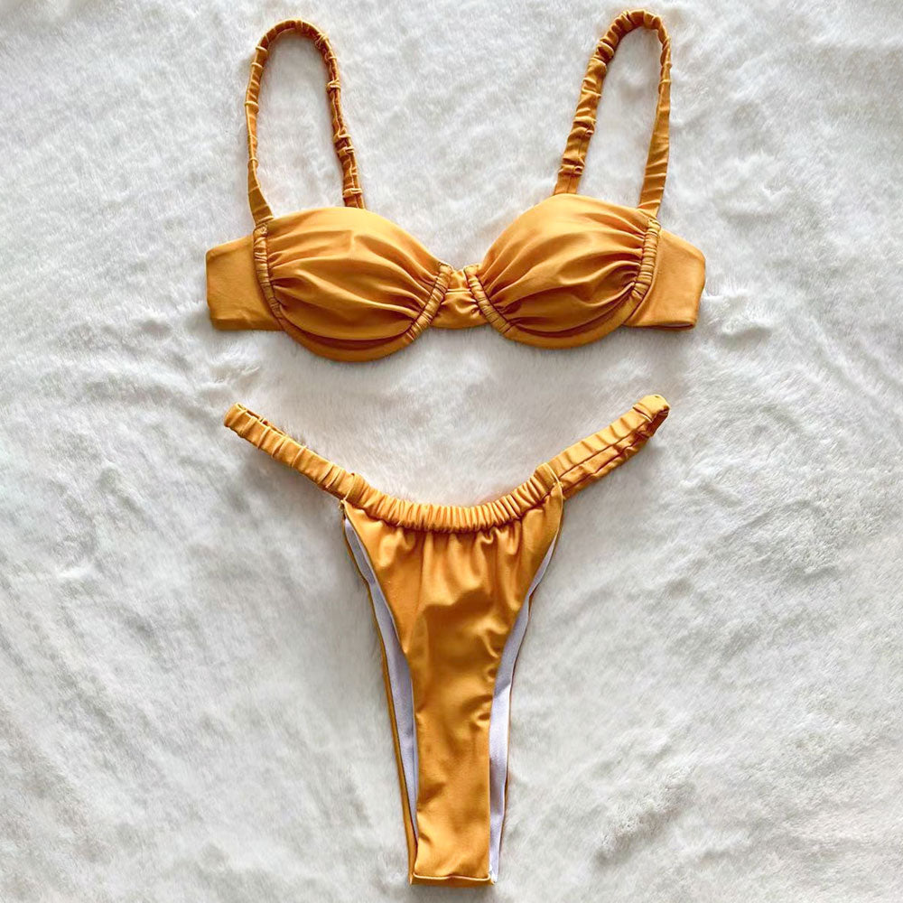 Machen Sie sich mit diesem Bikini-Set aus glänzendem Gold, das Sommerstimmung ausstrahlt, stilvoll bereit für sonnige Tage. Das Halbhochteil verfügt über gepolsterte Bügel-Cups, feste gerüschte Träger und einen sicheren Rückenverschluss für eine schicke und schmeichelhafte Passform. Kombiniert mit einem hochgeschnittenen Bikinihöschen in frecher Passform mit gebänderter Taille und nahtlosem gerüschtem Design strahlt dieser sexy Zweiteiler einen kühnen und doch luxuriösen Charme aus. Perfekt für Strandausflüge oder zum Entspannen am Pool – das ultimative Sommer-Statement.