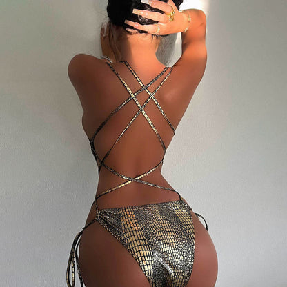 Brasilianischer Einteiler-Badeanzug mit metallischem Schlangenmuster und Schnürung, tiefem Rücken und hohem Beinausschnitt