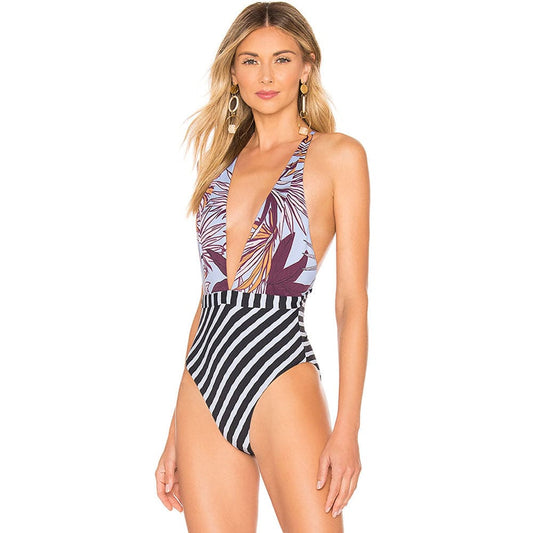 Einteiliger Badeanzug mit Blumenstreifen und tiefem V-Ausschnitt am Rücken Einteiliger Badeanzug mit Blumenstreifen und tiefem V-Ausschnitt am Rücken