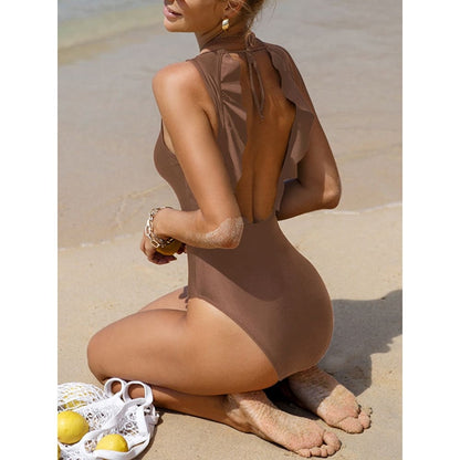 Solider Reißverschluss Rüschenärmel Rash Guard Einteilige Badeanzüge