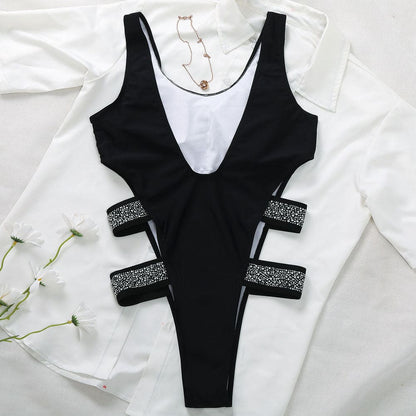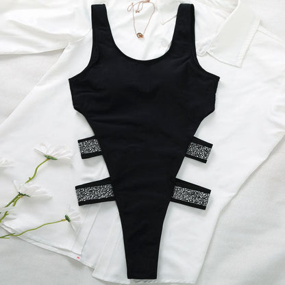 Einteiliger Badeanzug mit glitzerndem Kristallausschnitt und hohem Beinausschnitt