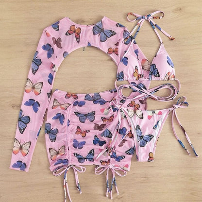 Butterfly Print Triangle Brazilian Four Piece Swimsuit