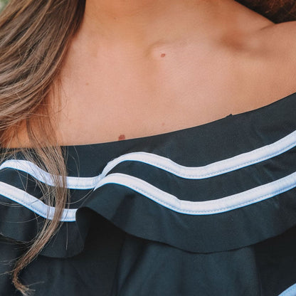 This striped bikini set promises an unforgettable holiday look. The two-piece swimsuit offers a stylish off-the-shoulder top with delicate layered ruffle trims and soft pad cups for a comfortable fit. The high-rise, moderate-cut bikini bottom completes the ensemble.