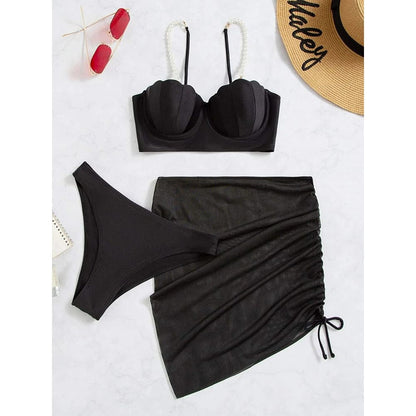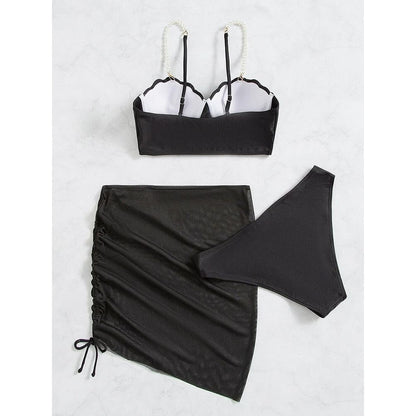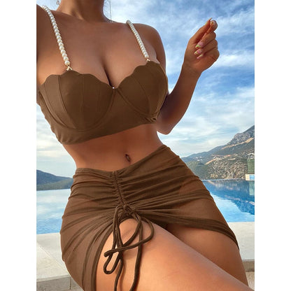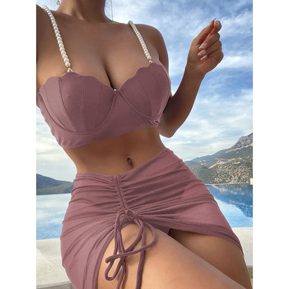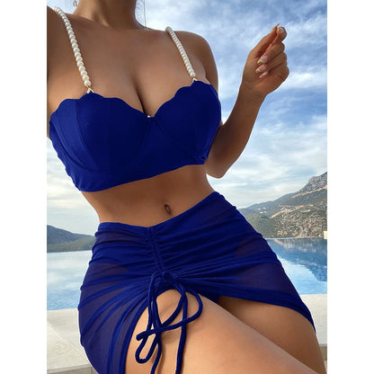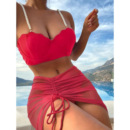 The swimsuit set is designed to flatter your figure while providing comfort and functionality. The high-waisted bottom helps to accentuate your curves and provides tummy control, while the push-up bikini top enhances your bust and provides support. The flowy skirt adds an extra touch of femininity and can be worn as a cover-up when you're out of the water. The swimsuit is made of high-quality materials that are durable and comfortable to wear, so you can enjoy your time at the beach or pool without any worries.