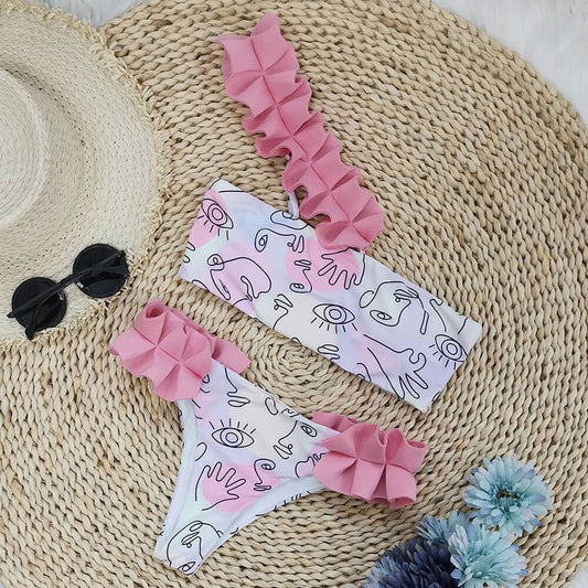 Bañador bikini brasileño con volantes y hombros descubiertos