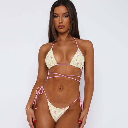 Traje de baño bikini brasileño de dos piezas con estampado floral, fruncido, atrevido y cruzado con lazo