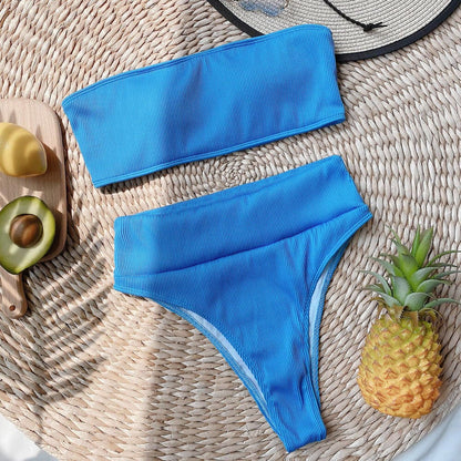 Bikini brasileño bandeau de corte alto con cintura alta de punto acanalado
