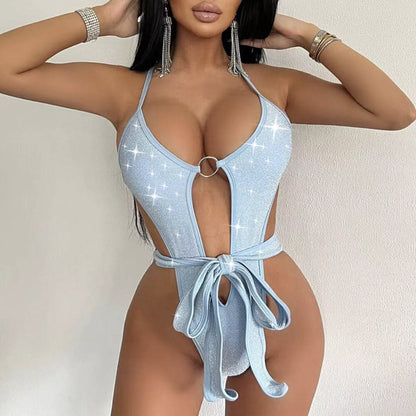 Si estás buscando un traje de baño que acentúe tus curvas y resalte tus mejores características, no busques más allá de nuestro traje de baño de una pieza Sparkly High Cut O Ring Cutout Low Back. El diseño de corte alto alarga las piernas, mientras que los cortes a los lados y al frente crean una silueta sexy y favorecedora. El detalle de la junta tórica aporta un toque de elegancia al diseño, haciendo que este bañador sea perfecto para cualquier ocasión.