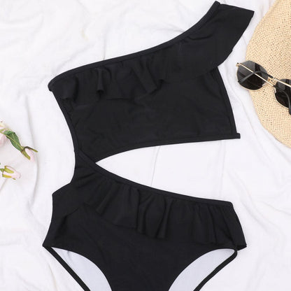 Traje de baño de una pieza con volantes de Sunnybikinis. Este traje de baño brasileño presenta un solo hombro con un escote inclinado, copas acolchadas suaves extraíbles, tirantes ajustables, un diseño calado ceñido alrededor de la cintura, un escote bajo en la espalda con lazos para que puedas ajustar el ajuste y la parte inferior del bikini a juego. Tiene cobertura media.