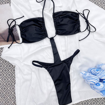 Traje de baño tanga Sunnybikinis. Este coqueto bañador de una pieza tiene un escote halter con efectos fruncidos, copas acolchadas suaves removibles para mayor comodidad, una espalda abierta con cortes, dos correas angostas que se atan en la espalda que favorecen a casi cualquier tipo de cuerpo y una parte inferior de bikini de tiras con una espalda diminuta que cubre y un alto -cortar las piernas para un acabado más largo.