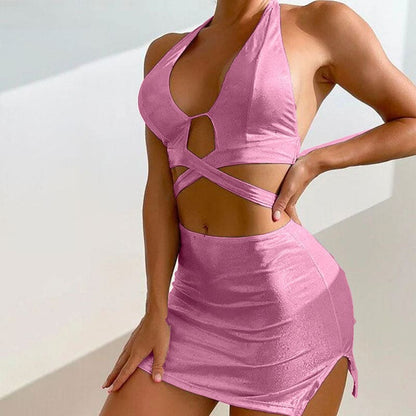 Traje de baño brasileño de tres piezas con cuello halter metalizado