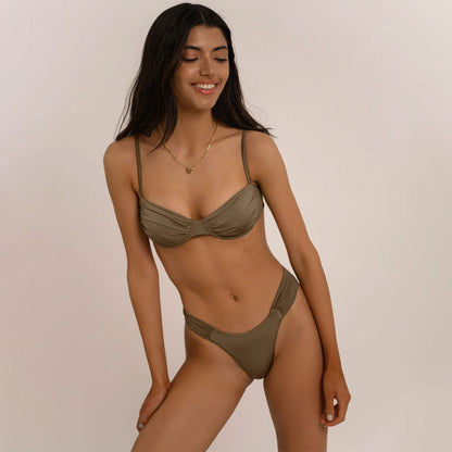 Este conjunto de bikini fruncido, lleno de encanto inesperado, aporta un aire de inspiración vintage a tu vestuario de trajes de baño. Con un top de baño estructurado con aros y almohadillas suaves extraíbles, tirantes ajustables, detalles fruncidos y un cierre de lazo en la espalda, ofrece un ajuste favorecedor y que brinda soporte. Combinado con braguitas de bikini de tiro bajo y corte alto que realzan tus curvas con una cobertura atrevida, este conjunto de dos piezas es perfecto para descansar junto a la piscina y escapadas elegantes a la playa.