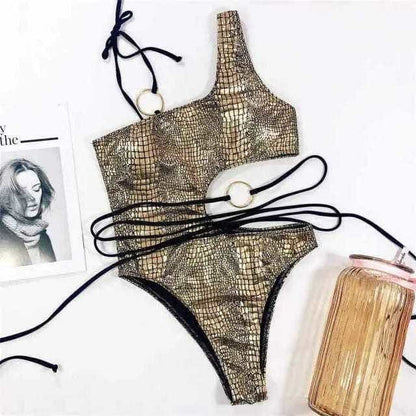 El traje de baño único de una pieza presenta un escote asimétrico con una correa de suspensión y cuerdas atadas en los hombros, tazas de acolchado suaves desmontables, un recorte en un lado, una cuerda con un anillo de metal alrededor de la cintura y la descarada parte inferior del bikini con piernas de corte alto. Todo en patrones metálicos de piel de serpiente.