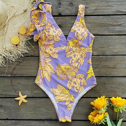 Maillot de bain une pièce brésilien à volants asymétriques fleuri