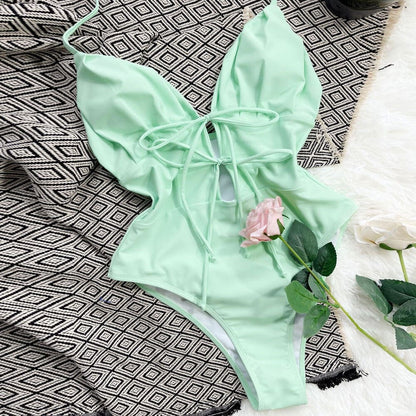 Cutout Tie String Halter Brazilian One Piece Swimsuit - Green / S On sale