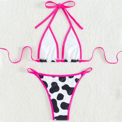 - Liens de contraste : Le lien de contraste rose vif ajoute une touche vibrante aux taches de vache ludiques, rendant ce bikini à la fois amusant et à la mode.