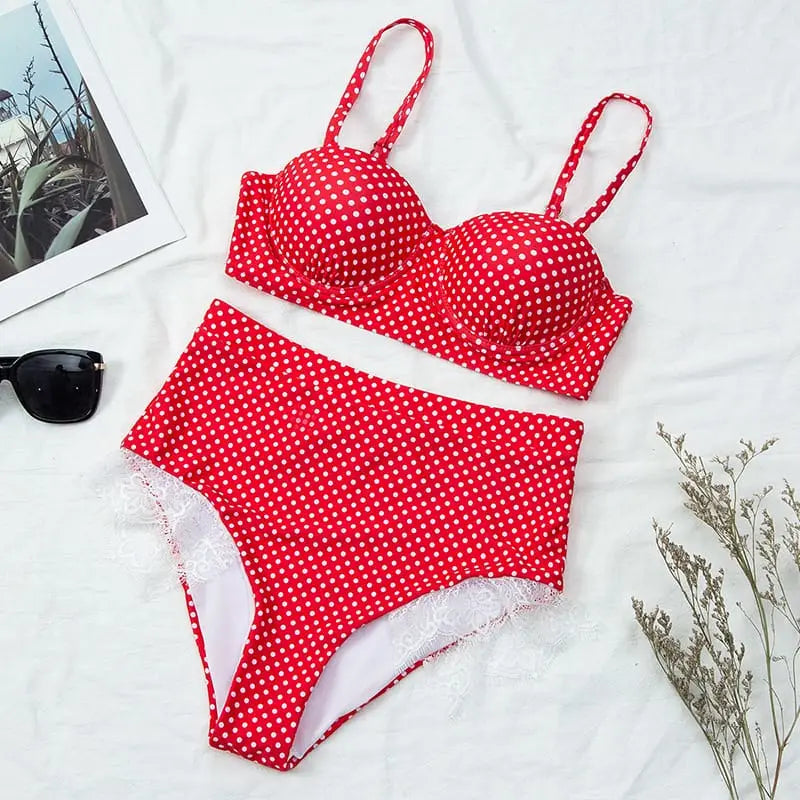 Maillot de Bain Bikini Push Up en Dentelle à Pois à Taille Haute