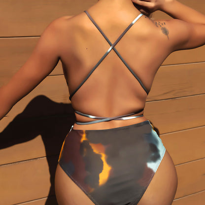 Costume da bagno intero brasiliano con scollatura profonda a V, schiena bassa e spalline incrociate in tie dye artistico.