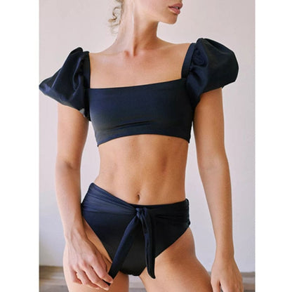 Bikini da annodare con maniche corte a sbuffo a vita alta