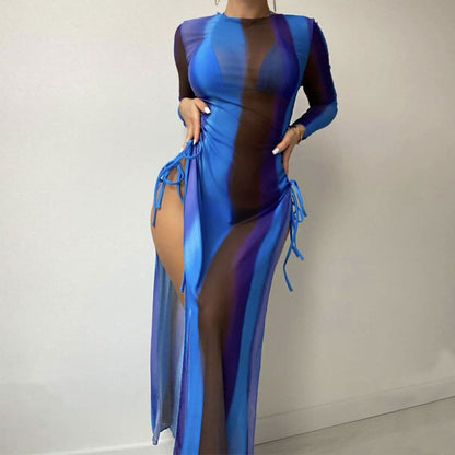 Completo bikini copricostume Sunnybikinis. Il costume da bagno brasiliano in tre pezzi è caratterizzato da un classico top a triangolo scorrevole con scollo all'americana, morbide coppe imbottite rimovibili, sottili lacci da annodare sul retro e uno slip bikini con perizoma abbinato con laccetti ai lati per regolare la vestibilità e copertura sfacciata della schiena . Aggiungi il copricollo abbinato, uno stile senza lacci con coulisse e spacchi laterali con motivi fluidi.