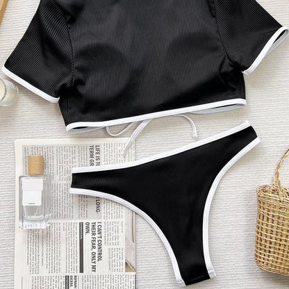 Costume da bagno bikini brasiliano a due pezzi sexy con maniche corte e gamba alta a contrasto