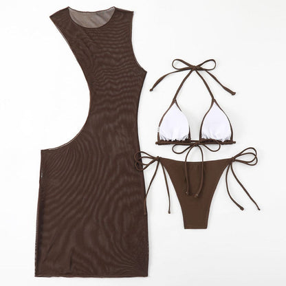 set bikini sexy, bikini brasiliano a perizoma, copricostume in rete trasparente, costume da bagno bikini con laccetti ai lati, costume da bagno bikini a triangolo, costume da spiaggia a tre pezzi, costume da bagno con ritagli, set bikini alla moda, copricostume asimmetrico in rete, costume da bagno per vacanze estive