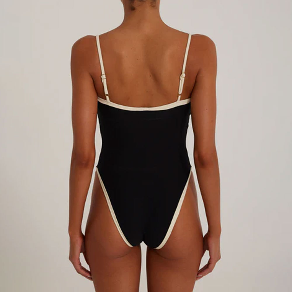 Abbraccia la tendenza minimalista con questo costume da bagno intero chic e senza sforzo. Caratterizzato da un scollo quadrato e delicate spalline regolabili, questo design senza tempo è elevato da un sottile bordo a contrasto per un tocco di sofisticatezza. Le gambe ultra alte e la copertura posteriore audace creano una silhouette lusinghiera, mentre i morbidi cuscinetti removibili garantiscono una vestibilità comoda. Perfetto per un'eleganza sobria in spiaggia o a bordo piscina.