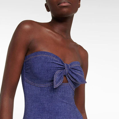 Costume da bagno intero brasiliano con stampa in denim, gonna a righe vintage, fiocco e bandeau