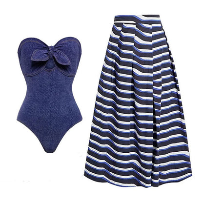 Porta il tuo guardaroba estivo al livello successivo con un costume da bagno intero a stampa denim e una gonna coprente a righe che uniscono fascino informale ed eleganza raffinata. Il costume da bagno senza spalline presenta un dettaglio a fiocco giocoso sul busto, esaltando il suo fascino femminile, mentre la stampa ispirata al denim, i cuscinetti removibili e la vestibilità moderata lo rendono una nuova tendenza. Abbinato a una gonna plissettata a vita alta con righe audaci, questo set è perfetto per rilassarsi in spiaggia o per una fuga elegante in un resort.