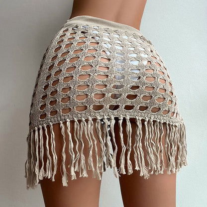 ハイウエストかぎ針編みニットフリンジビーチカバーアップミニスカート