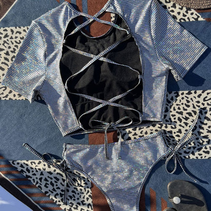 - 特徴: 太陽が降り注ぐ冒険、きらめく魅力、ビーチサイドのシック、遊び心のあるエレガンス、サーフィンにぴったりのスタイル、半袖ラッシュガード、レースアップバック、ビーチファッション、日焼け止め、海辺の夢