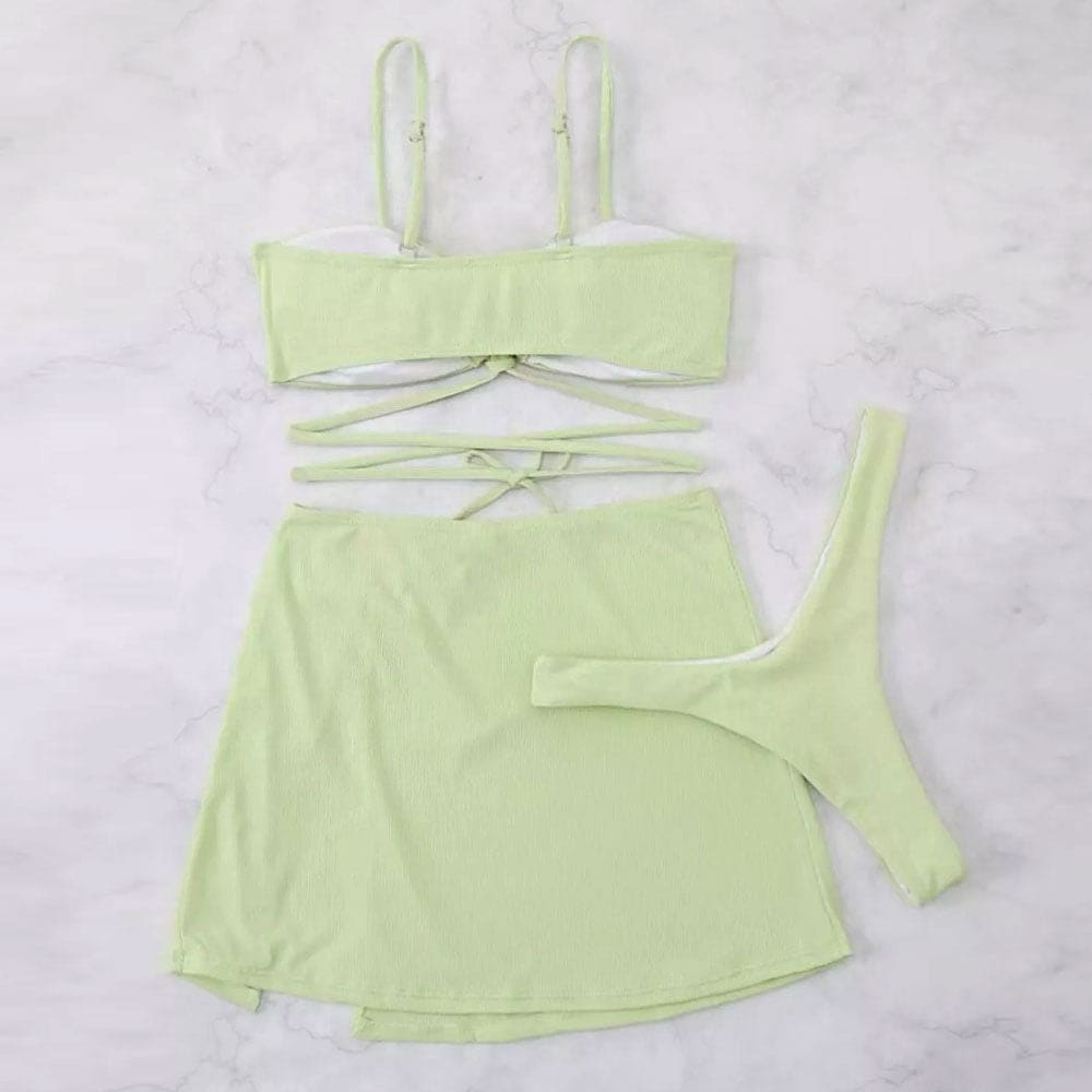 サニービキニのコントラストリブハートビキニセット。ブラジリアン スリーピース水着は、快適な取り外し可能なソフト パッド付きカップを備えたチューブ トップ、全体にリブのデザイン、シャーリングのアクセントと対照的なハートのディテール、調節可能なスリムなショルダー ストラップ、ウエスト周りのタイ ストラップ、安全性を高めるための背面のゴムバンド、マッチングが特徴です。ハイレグカットで背中が生意気なビキニボトム。お揃いのセミシアー ビーチ ミニ スカートで締めくくりましょう。