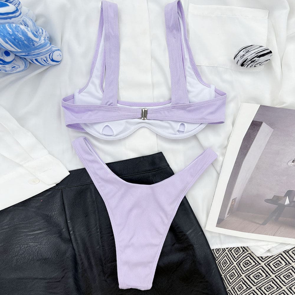 サニービキニの質感のあるビキニセット。ブラジリアン ツーピースは、ブラレット デザインのプッシュアップ スイム トップ、全体にリブ編みのテクスチャー、サポート力のあるモールド カップとサスペンダー、後ろのシルバートーンのクロージャー、お揃いのビキニ ボトムが生意気なカバー力とハイレッグ カットを特徴としています。