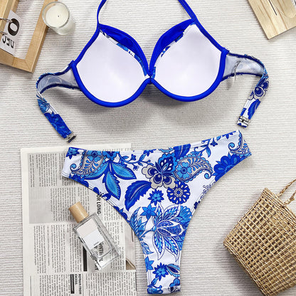 トロピカルフローラルミッドウエスト生意気なアンダーワイヤーブラジリアンツーピースビキニ水着
