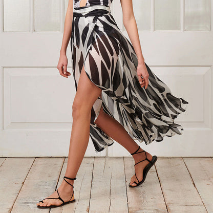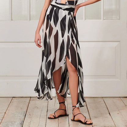 シンプルさの美しさを楽しむ、コントラストとスタイルを重視したこの白黒のカラーブロックプリントのワンピースとマッチングのカバーアップスカート。構造的な水着は、サポート力のあるアンダーワイヤー付きのバスティエスタイルのトップ、調整可能なストラップ、そしてフラッタリングなシルエットを作るウエストを引き締めるベルトを特徴としています。エアリーなラップスタイルのスカートは、優雅さを加えながら effortless に流れます。ビーチサイドでのくつろぎやシックなリゾート逃避に最適です。