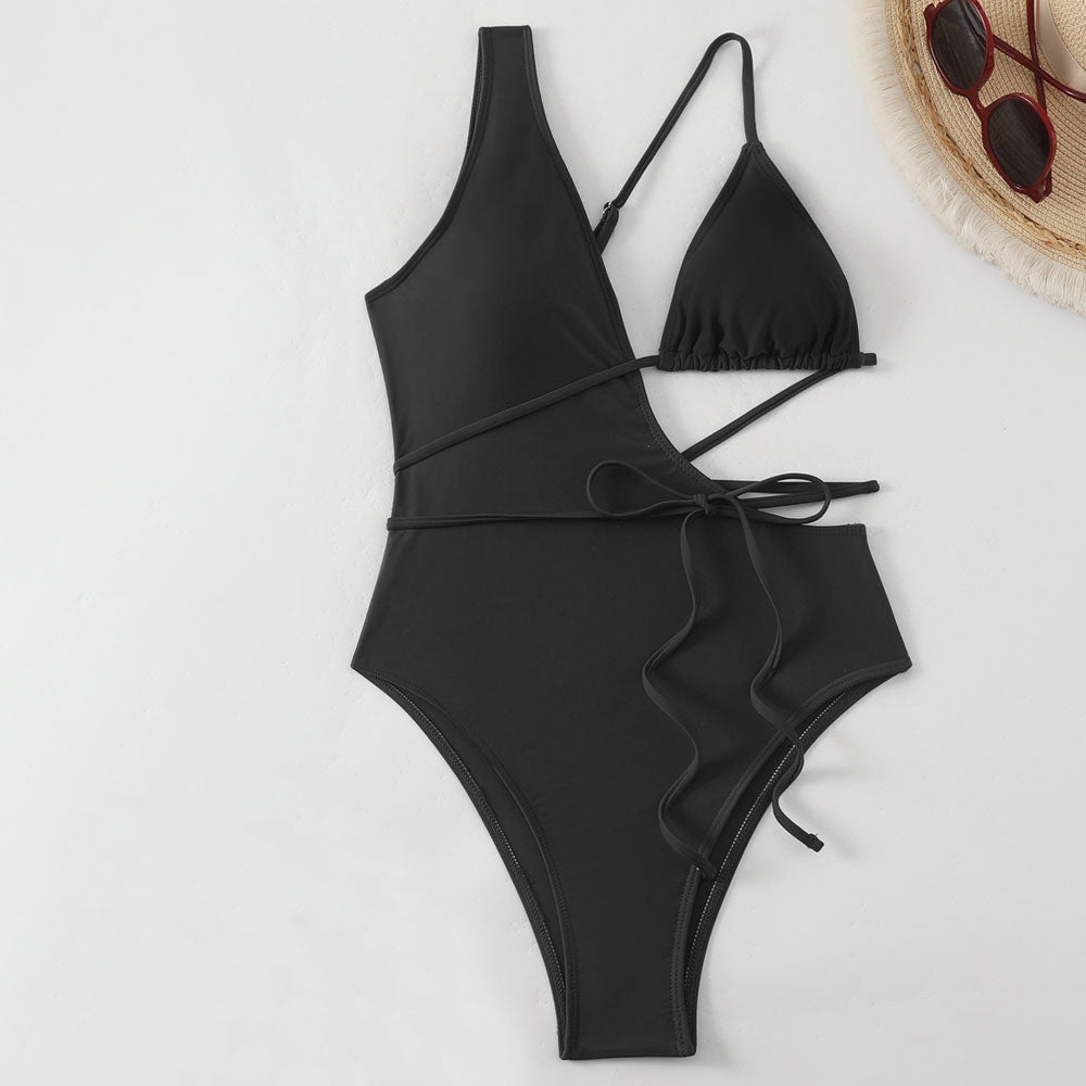 Turn up the heat with this daring black one-shoulder Brazilian one-piece swimwear. Featuring an asymmetric neckline that combines a sleek one-shoulder strap with a sliding triangle swim top on the other side, this sexy bathing suit includes removable padding for customizable comfort and support. Adjustable straps provide a secure and personalized fit, while the strappy wraparound detail elegantly highlights your waist. With a cheeky high-leg cut that flatters your curves, pair it with a mesh cover-up, platform sandals, and cat-eye shades for a retro-inspired poolside vibe.