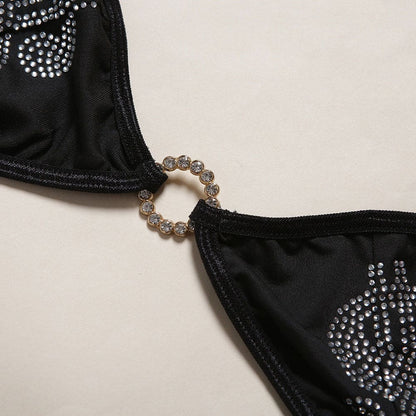 Are you looking to create a stylish yet effortless look? Look no further than this must-have black bikini set! The unique two-piece swimsuit features a sliding triangle swim top with a halter tie, removable soft padding cups for comfort, dollar patterns, and an updated loop at the center front with shiny rhinestones. Additionally, the top features tie fastenings to the rear. The matching string bikini bottom has elastic strings at the sides with silver-tone hoops and cheeky back coverage to add a dose of seduction.