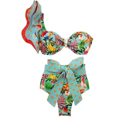 Floral Print High Waist Ruffle Shoulder Bikini Swimsuit