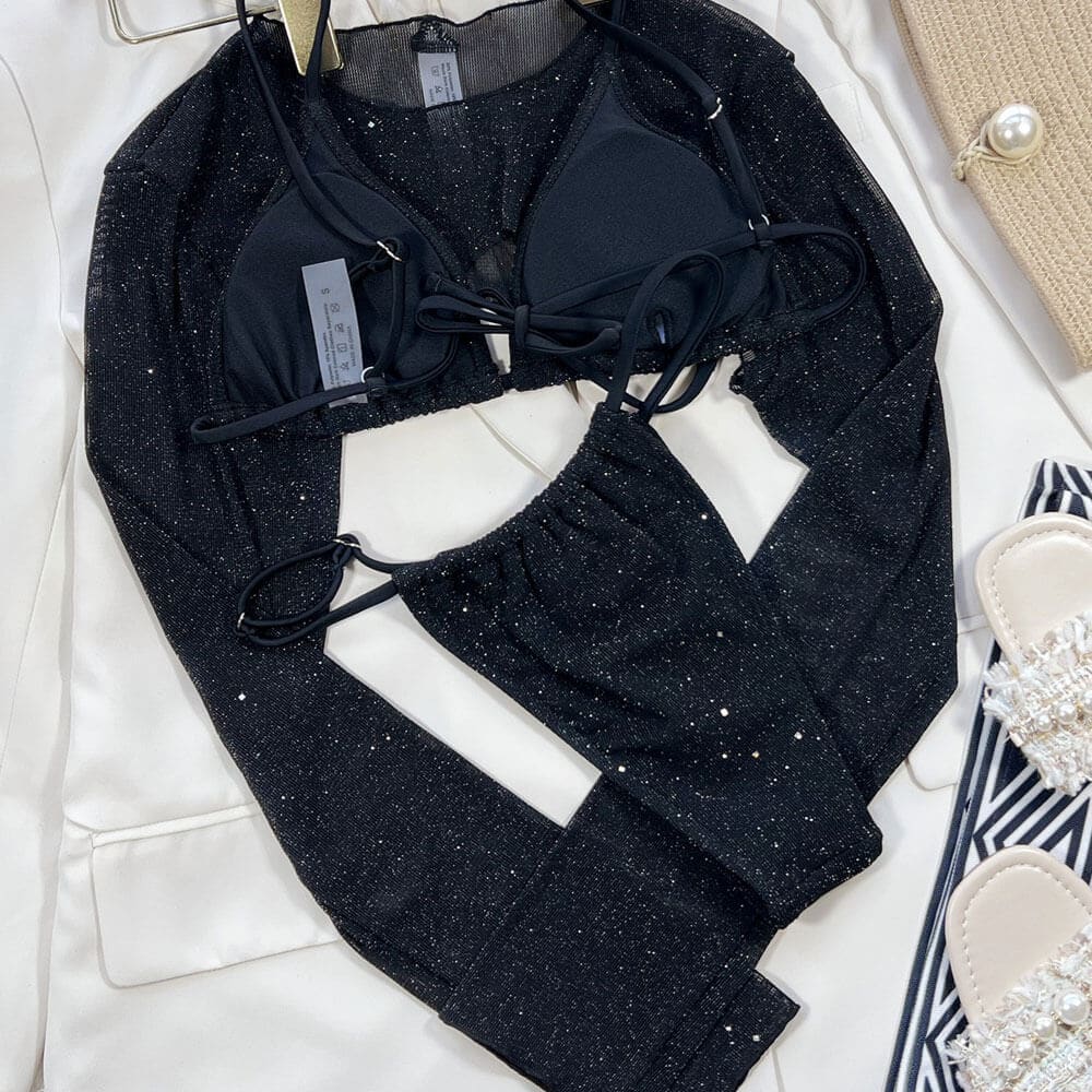 Sunnybikinis sparking long sleeve crop top bikini set. The three-piece swimsuit features a dazzling triangle bikini top with removable soft padded cups for comfort, adjustable dainty shoulder straps, and a functional black tie for an ideal fit. The matching string bikini bottom has a sliding design and an adjustable buckle that's easy to take from beach to party. The matching long sleeve mesh top completes the charming look.