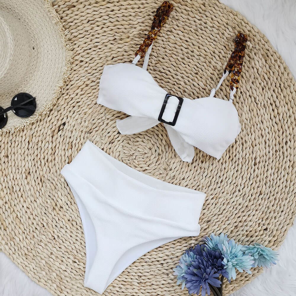 Sunnybikinis textured bikini set. The Brazilian two-piece features a cute top in a simple silhouette, acrylic shoulder straps with chain links that give the top a unique and elevated feel, a decorative dark acrylic buckle at the chest, and a self-tie closure at the back. The matching bikini bottom has a high-waisted waistband that proves to be as trendy as it is sporty for the beach.