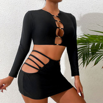 Sunnybikinis sarong solid bikini set. This three-piece Brazilian swimsuit features a unique top with removable soft padded cups, seductive cut-out details with polished chains, slip-on styling with long sleeves, and a matching string bikini bottom with elastic side ties and cheeky back coverage. Add the matching beach mini skirt with cheeky cut-outs at the sides.