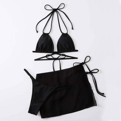 Strappy Sarong Triangle Halter Three Piece Swimsuit - Black / S On sale