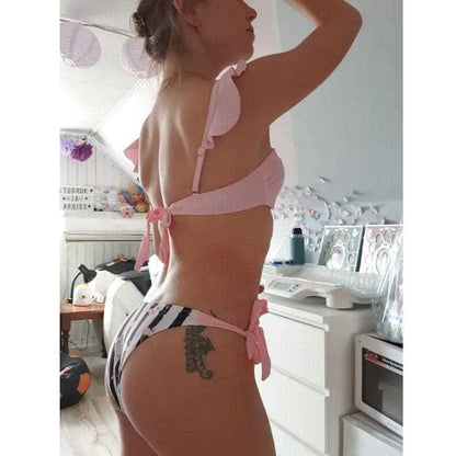 Striped Lace Ruffle Push Up Women Bandeau Bikini Swimsuit