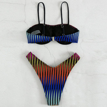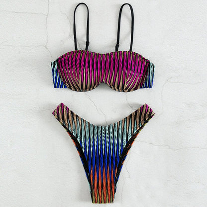 The beautiful gradient tropical leaf print of this two-piece swimsuit is both trendy and eye-catching. The vibrant hues of green, yellow, and orange are perfect for adding a pop of color to your beach or poolside look. The unique print is sure to turn heads and make you stand out in a crowd.
