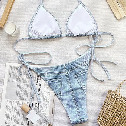 Vintage Denim Print Tie String Cheeky Triangle Brasileiro Biquíni Maiô de Duas Peças