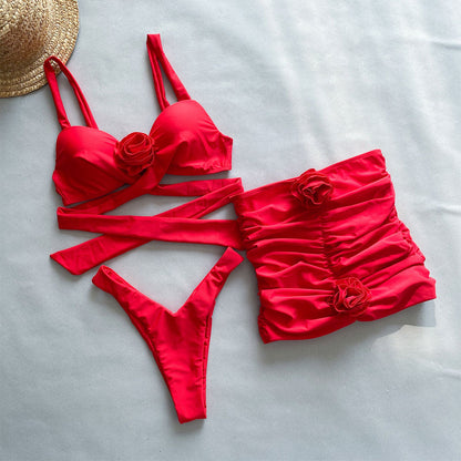 O vermelho poderoso ocupa o centro das atenções neste impressionante conjunto de biquíni floral. O top de natação estruturado apresenta alças largas fixas, um ousado aplique floral 3D no centro, copas moldadas com aro e laços envolventes para um ajuste lisonjeiro. As partes de baixo do biquíni de estilo brasileiro, com perna alta, assentam-se baixas na frente e oferecem cobertura atrevida na parte de trás. Combinado com uma saia mini franzida adornada com acentos florais em cascata, este vibrante conjunto de três peças exala elegância e confiança.